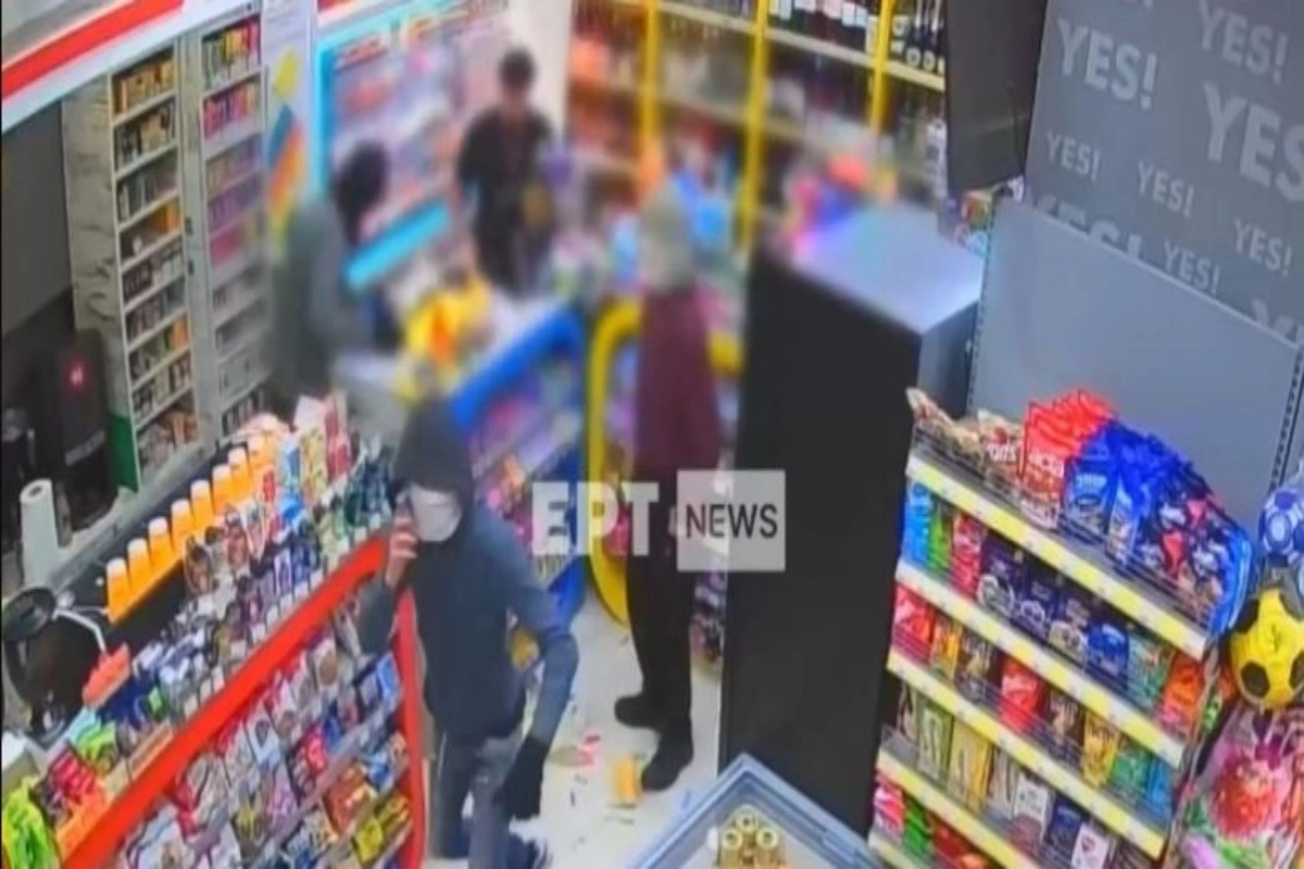 Οι τρεις κακοποιοί απεικονίζονται να μπαίνουν σε μίνι μάρκετ και φωνάζοντας ληστεία ακινητοποιούν τον υπάλληλο του καταστήματος.