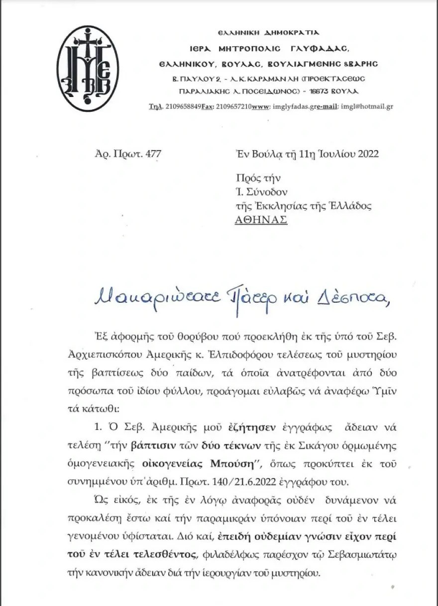 Ο Μητροπολίτης Γλυφάδας, επισημαίνει ότι στέλνει την επιστολή «εξ αφορμής του θορύβου που προεκλήθη» και λέει ότι αυτός δεν είχε ενημερωθεί για το τι θα κάνει ο Αρχιεπίσκοπος Ελπιδοφόρος. Όπως τονίζει ο κκ Αντώνιος «ο Σεβασμιότατος Αμερικής μου εζήτησεν εγγράφως άδειαν να τελέση «την βάπτισην των δύο τέκνων της εκ Σικάγου ορμώμενης ομογενειακής οικογένειας Μπούση».