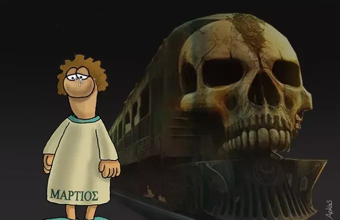 Το σημερινό σκίτσο του Αρκά αποτυπώνει την ανείπωτη σιδηροδρομική τραγωδία στα Τέμπη. Συγκεκριμένα, σε μαύρο φόντο σε μια σιδηροδρομική γραμμή κινείται ένα μαύρο τρένο με οδηγό τον Χάρο, ως μια νεκροκεφαλή. Σε πρώτο πλάνο διακρίνεται ο ο μήνας «Μάρτιος», με σκυφτό το κεφάλι όντας δακρυσμένος.