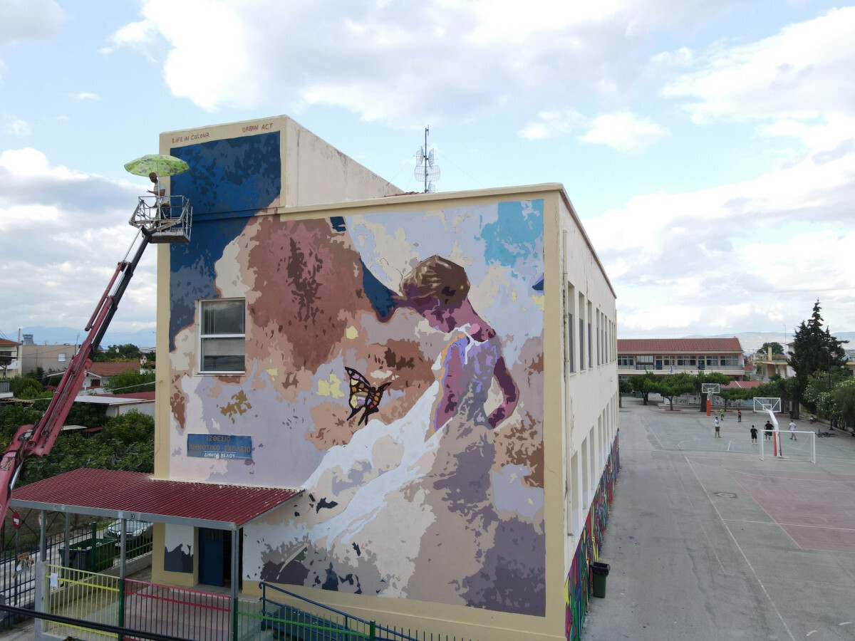Η τοιχογραφία έγινε στα πλαίσια του προγράμματος της UrbanAct «Ζωγραφίζοντας Σχολικά Κτίρια» και υλοποιήθηκε μετά από πρόσκληση του Συλλόγου Γονέων και Κηδεμόνων, από τον Life In Colour. Όπως αναφέρει στη σελίδα του στο facebook ο Σύλλογος Γονέων του δημοτικού σχολείου «το πρόγραμμα περιελάμβανε τη δημιουργία μιας μεγάλης δημόσιας τοιχογραφίας και συμμετοχικές δράσεις από τους μαθητές σε χαμηλότερες επιφάνειες του σχολείου.