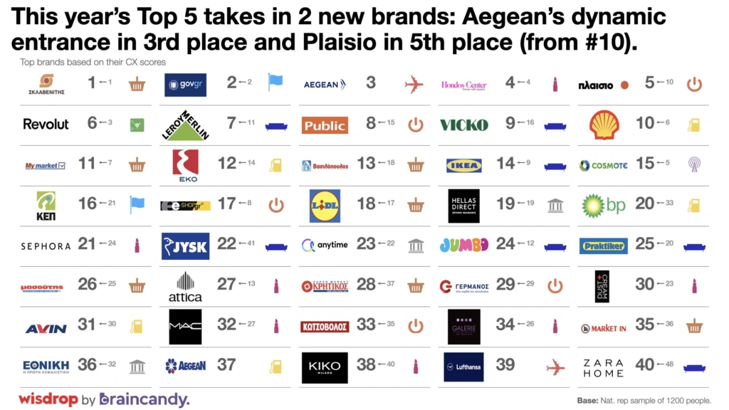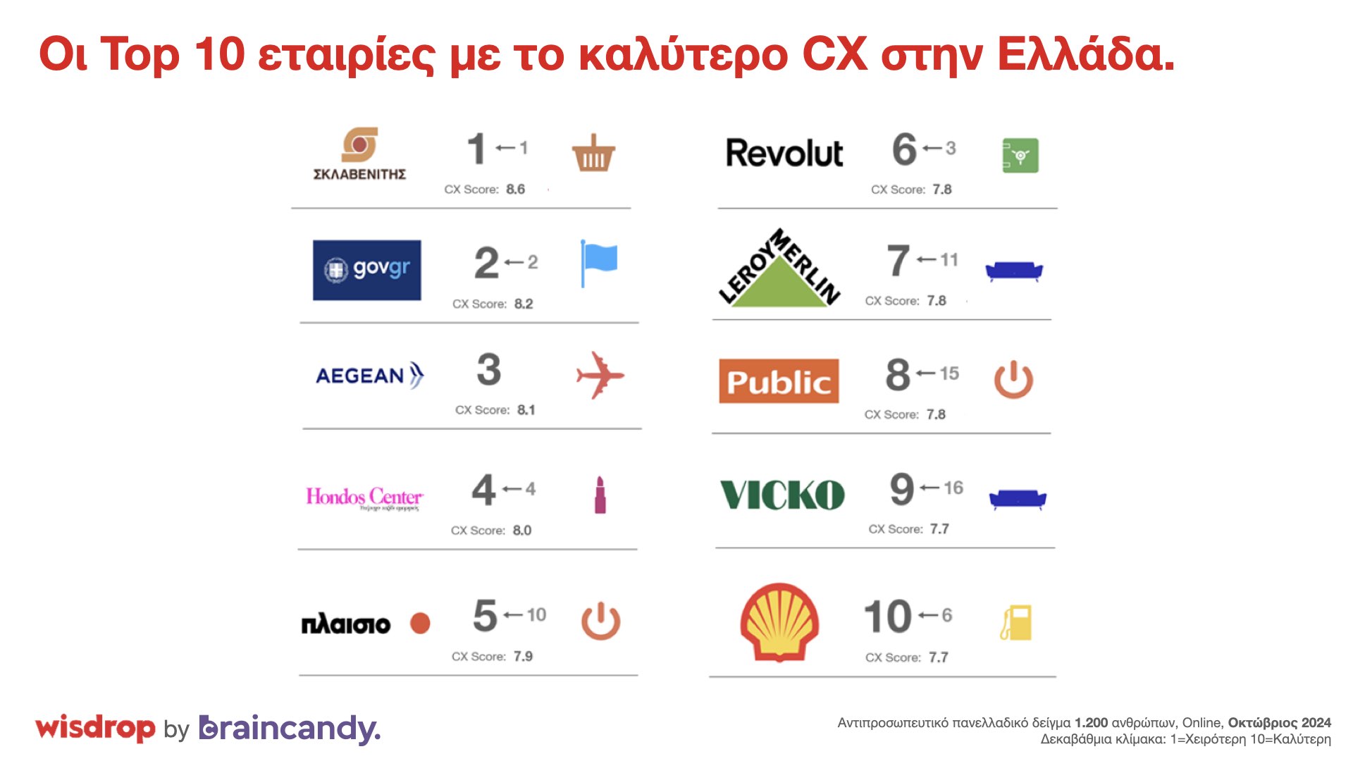 Να σημειωθεί ότι στο μικροσκόπιο της έρευνας, η οποία πραγματοποιήθηκε διαδικτυακά από την Braincandy, σε δείγμα 1.200 ανθρώπων, αντιπροσωπευτικό του ελληνικού πληθυσμού, τον Οκτώβριο του 2024, συμμετείχαν brands από 11 διαφορετικούς κλάδους (Τράπεζες, Εταιρείες Ενέργειας, Home Stores, Supermarkets, Εταιρείες Τηλεπικοινωνιών, Cosmetic Stores, Technology Stores, Ασφαλιστικές Εταιρείες, Δημόσιο, Εταιρείες Καυσίμων Αεροπορικές).