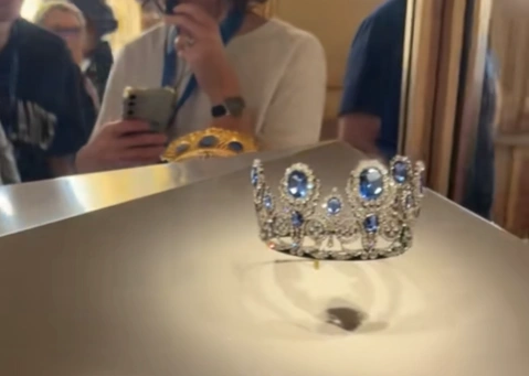 Το βίντεο που έγινε viral, δείχνει την νεαρή να θαυμάζει τη βιτρίνα με την τιάρα, το κολιέ και τα σκουλαρίκια με τα χαρακτηριστικά μπλε ζαφείρια που φορούσαν οι βασίλισσες Μαρία Αμαλία και Ορτάνς.