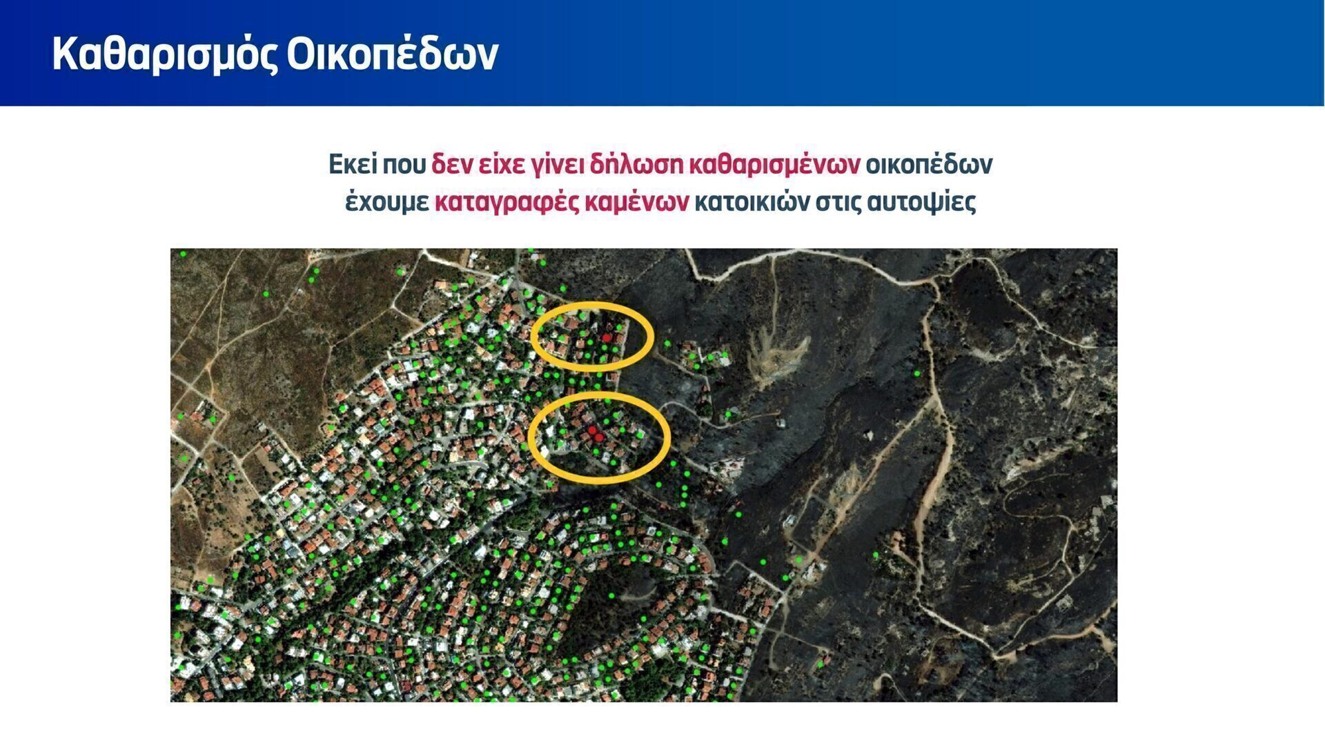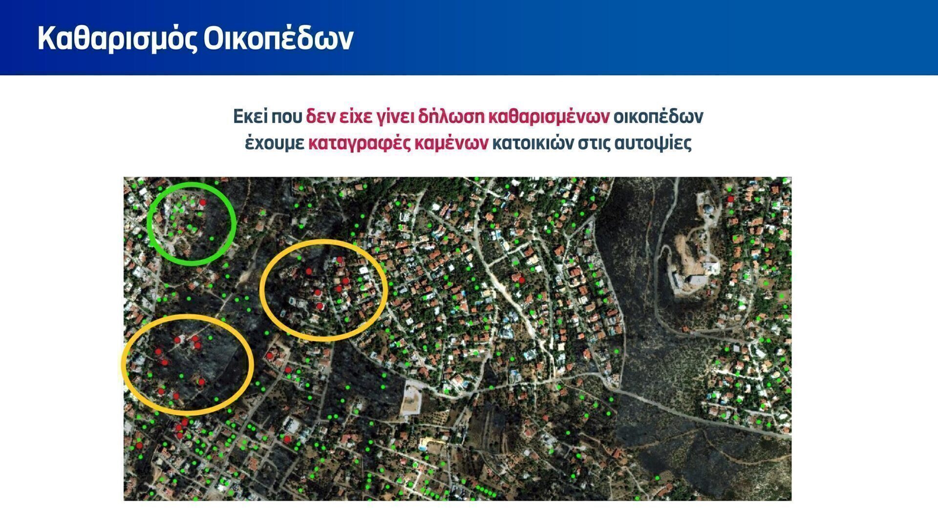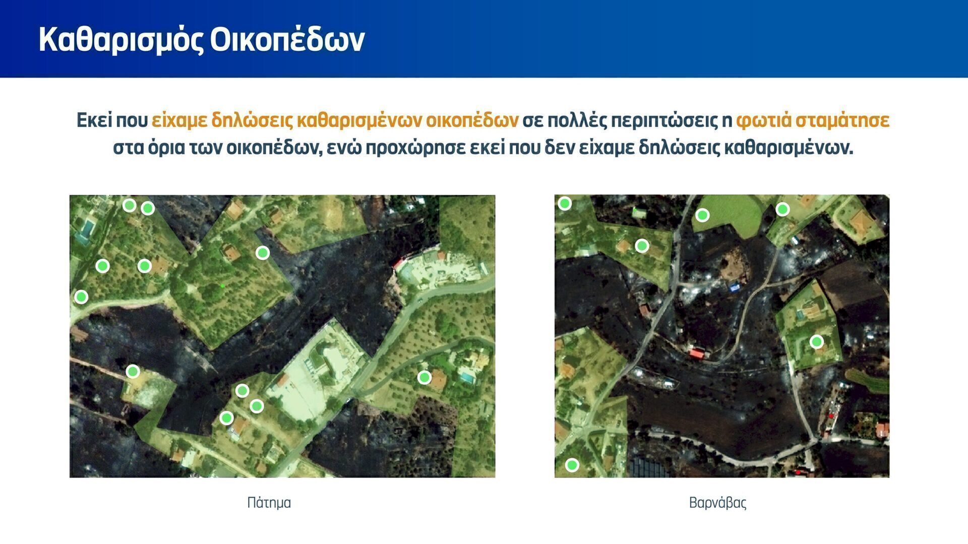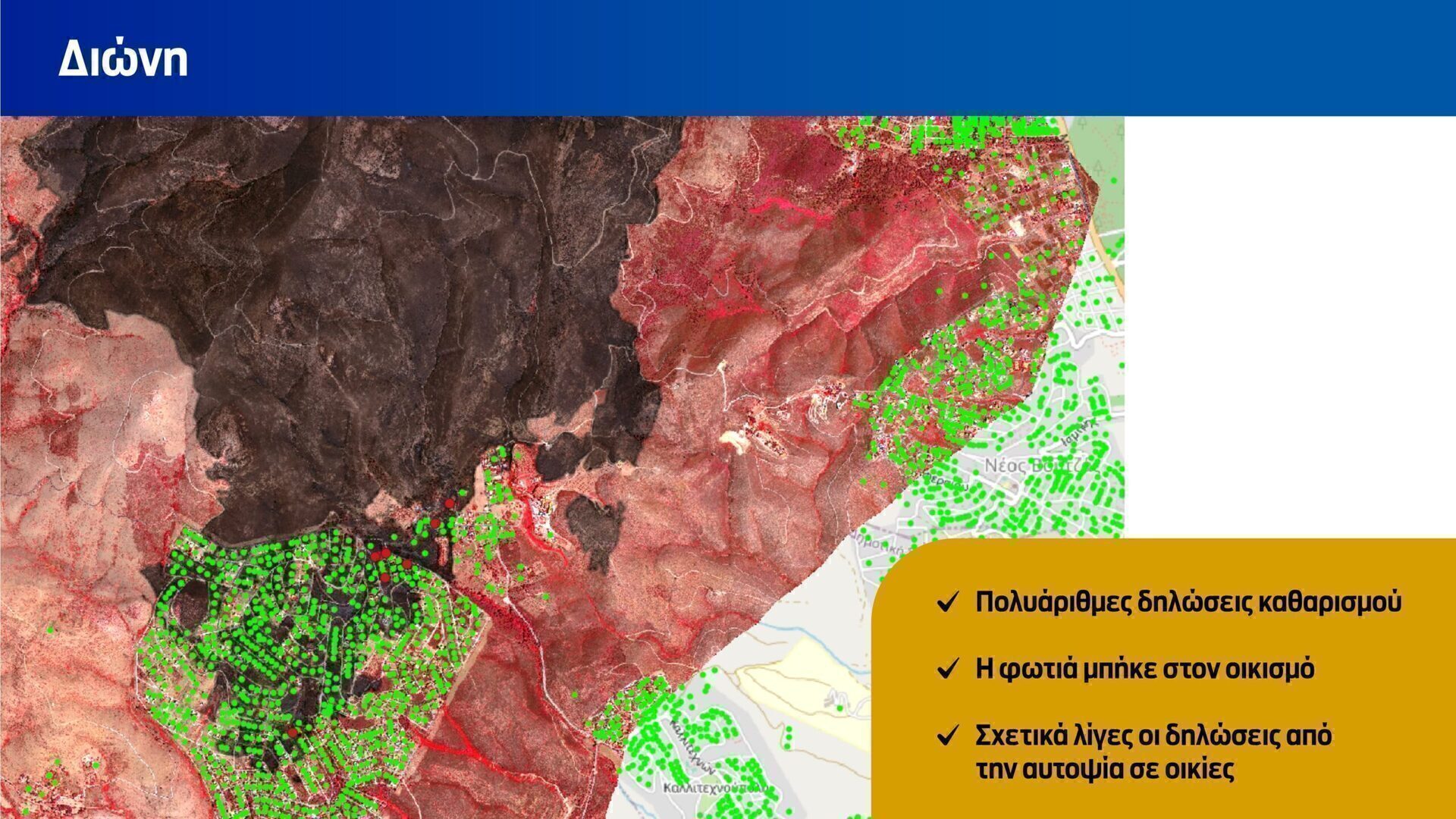 Ενα ενδιαφέρον συμπέρασμα για την αποτελεσματικότητα του μέτρου καθαρισμού των οικοπέδων προκύπτει από την ανάλυση των δεδομένων και αντιπαραβολή με τις 83.000 δηλώσεις καθαρισμού οικοπέδων στις πυρόπληκτες περιοχές. Στις περιοχές που υπήρχαν πολλές δηλώσεις καθαρισμού, η φωτιά στις περισσότερες περιπτώσεις δεν προχώρησε στο εσωτερικό τους, ενώ εκεί που δεν υπήρχαν η φωτιά εξαπλώθηκε πιο μαζικά. Χαρακτηριστικό παράδειγμα είναι ο οικισμός της «Διώνης» στον Δήμο Ραφήνας – Πικερμίου. Στην περιοχή είχαν γίνει 300 δηλώσεις καθαρισμού και, ενώ η πυρκαγιά διέσχισε μέρος του οικισμού, δεν υπήρξαν σημαντικές ζημιές σε κατοικίες.