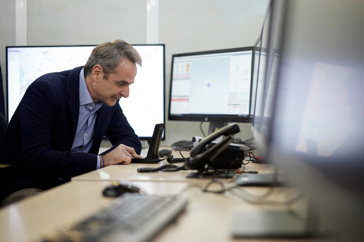 Σύμφωνα με την ενημέρωση του Γραφείου Τύπου του Πρωθυπουργού, ο Κυριάκος Μητσοτάκης αρχικά συνομίλησε με τους εργαζόμενους που ήταν σε υπηρεσία στο συντονιστικό και τηλεφωνικό κέντρο.
