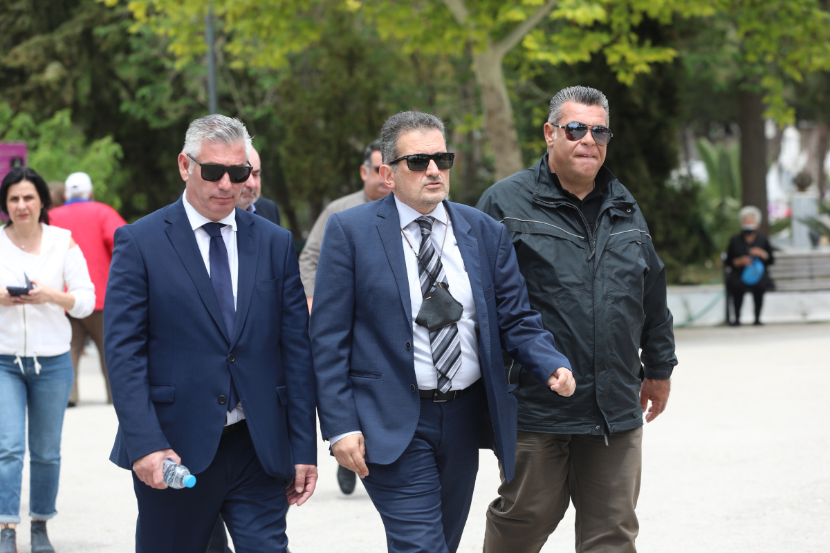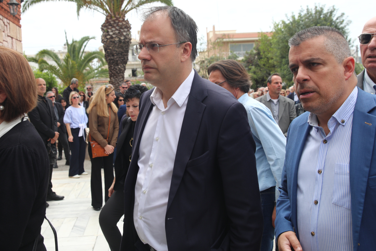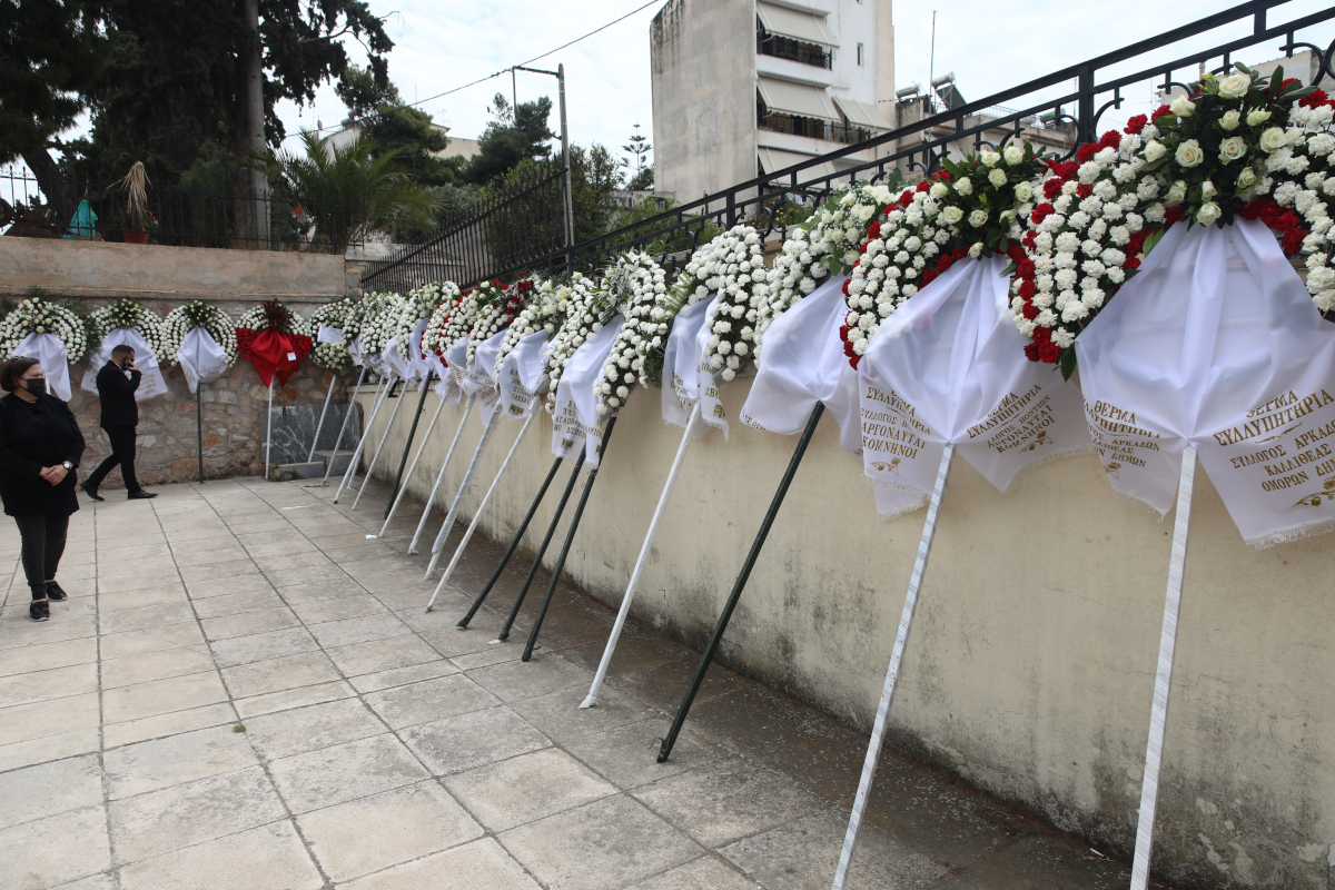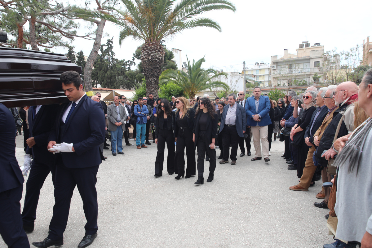 Στην κηδεία παραβρίσκονται, μεταξύ άλλων, ο Χρήστος Παπουτσής, η Σοφία Βούλτεψη και η Λούκα Κατσέλη.