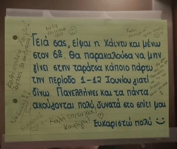 «Γεια σας, είμαι η Χάιντι και μένω στον 6ο. Θα παρακαλούσα να μην γίνει στην ταράτσα κάποιο πάρτι την περίοδο 1-12 Ιουνίου γιατί δίνω Πανελλήνιες και τα πάντα ακούγονται πολύ δυνατά στο σπίτι μου. Ευχαριστώ πολύ» έγραφε στο σημείωμά της η αριστούχος πια μαθήτρια που κατάφερε να μπει στη Νομική.
