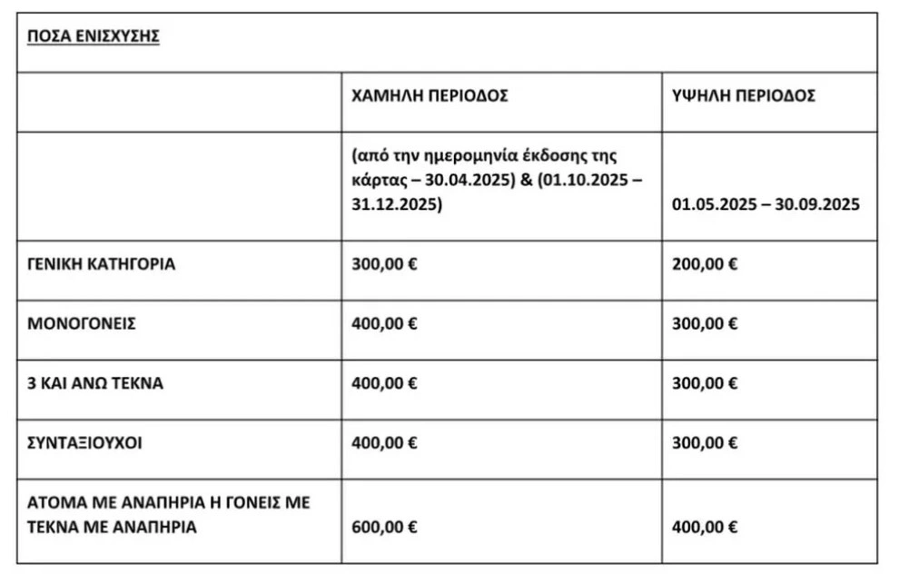 Συγκεκριμένα τα ποσά ενίσχυσης για την Χαμηλή Περίοδο (από την ημερομηνία έκδοσης της κάρτας – 30.04.2025 & 01.10.2025 – 31.12.2025) και την Υψηλή Περίοδο (01.05.2025 – 30.09.2025) διαμορφώνονται ως εξής: