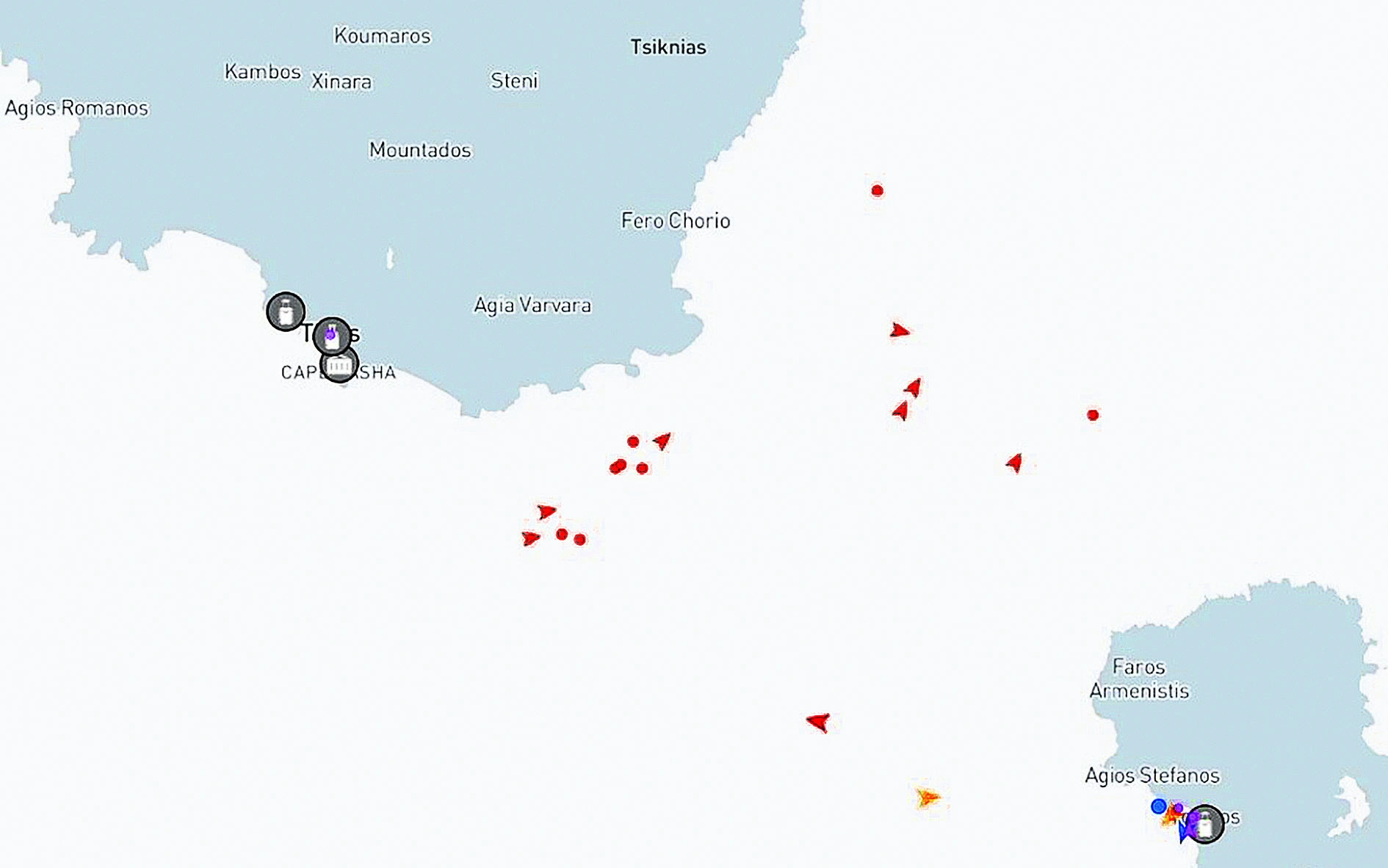 Από τις 30 Ιουνίου τουλάχιστον 14 τουρκικές μηχανότρατες εντοπίστηκαν να κινούνται νότια της Σερίφου, 2 ακόμη βόρεια αυτής και νότια της Κύθνου, ενώ επιπλέον 5 πλέουν δυτικά της Σύρου. Παράλληλα, 7 ακόμη σκάφη εντοπίστηκαν να κινούνται δυτικά μέχρι και τα Κύθηρα. Ολες φαίνεται πως κατέληξαν στα στενά της Τήνου και παραμένουν εκεί εδώ και τρεις ημέρες.