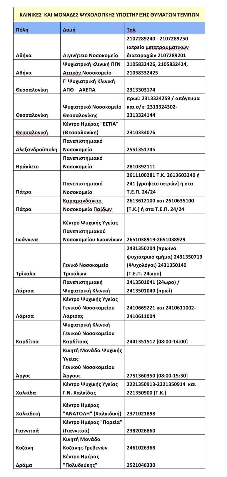 ΚΛΙΝΙΚΕΣ ΚΑΙ ΜΟΝΑΔΕΣ ΨΥΧΟΛΟΓΙΚΗΣ ΥΠΟΣΤΗΡΙΞΗΣ ΘΥΜΑΤΩΝ ΤΕΜΠΩΝ