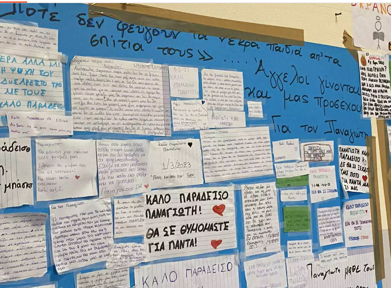 «Ποτέ δεν φεύγουν τα νεκρά παιδιά απ’ τα σπίτια τους, γίνονται άγγελοι και μας προσέχουν», «Πάνο μου, να μας προσέχεις από εκεί ψηλά», «Θα είσαι πάντα στην καρδιά μας», «Εκεί ψηλά θα είσαι στην αγκαλιά του πατέρα και της μητέρας σου», γράφουν ορισμένα από τα μηνύματά του, για τον μαθητή που χάθηκε τόσο άδικα στο δυστύχημα στα Τέμπη.