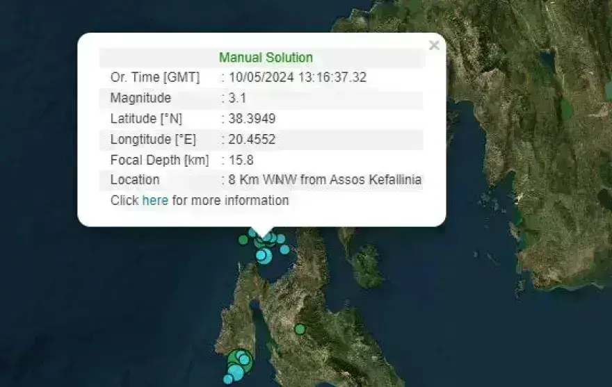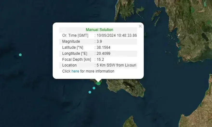 Ειδικότερα, η πρώτη σεισμική δόνηση μεγέθους 3,9 Ρίχτερ καταγράφηκε στις 13.48 με επίκεντρο 5 χιλιόμετρα νότια – νοτιοδυτικά από το Ληξούρι και εστιακό βάθος 15,2 χιλιόμετρα.