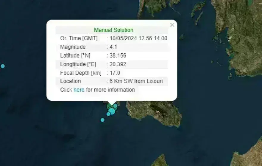 Η δεύτερη μεγέθους 4,1 Ρίχτερ στις 15.56, με επίκεντρο 6 χιλιόμετρα νοτιοδυτικά από το Ληξούρι και εστιακό βάθος 17 χιλιόμετρα.