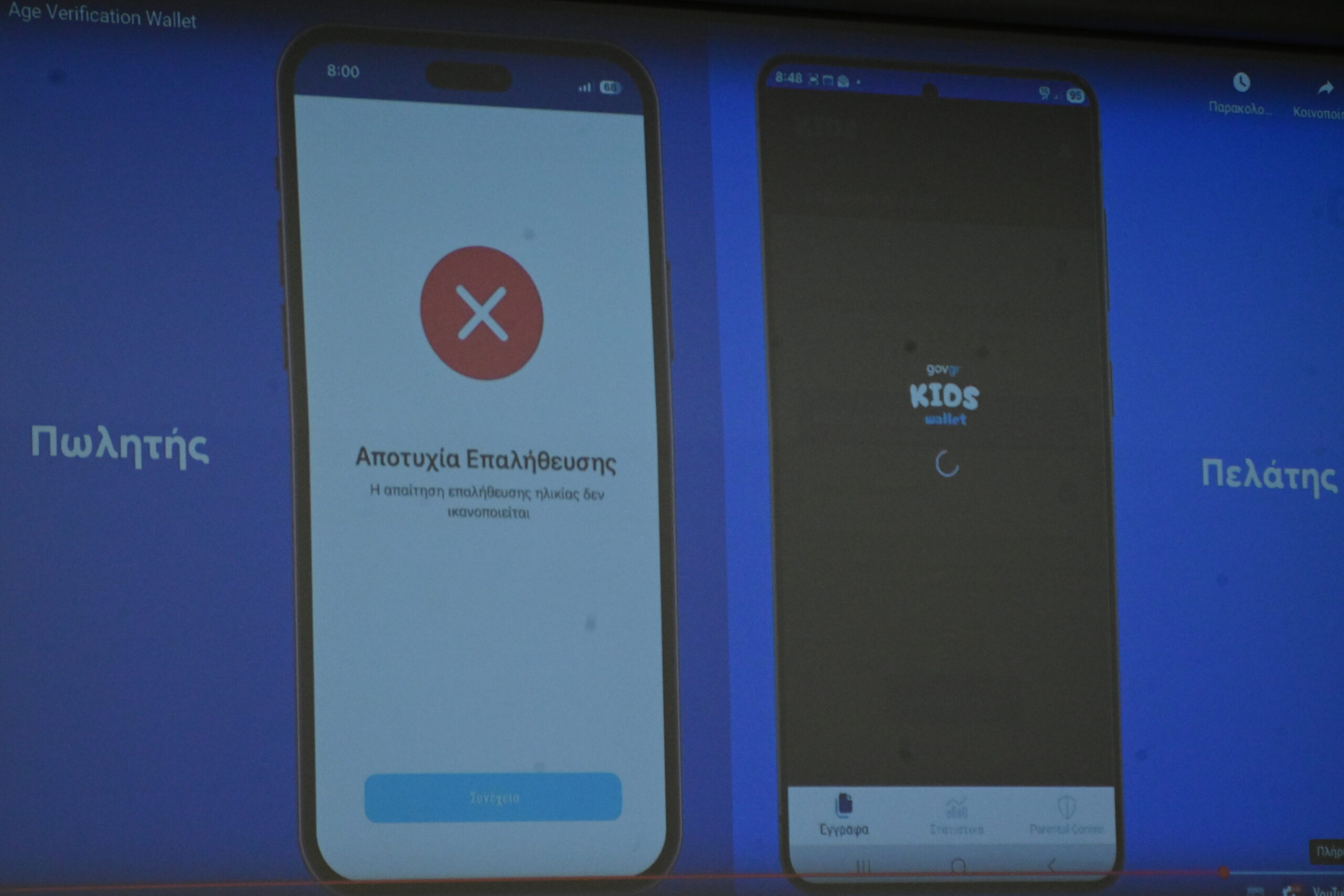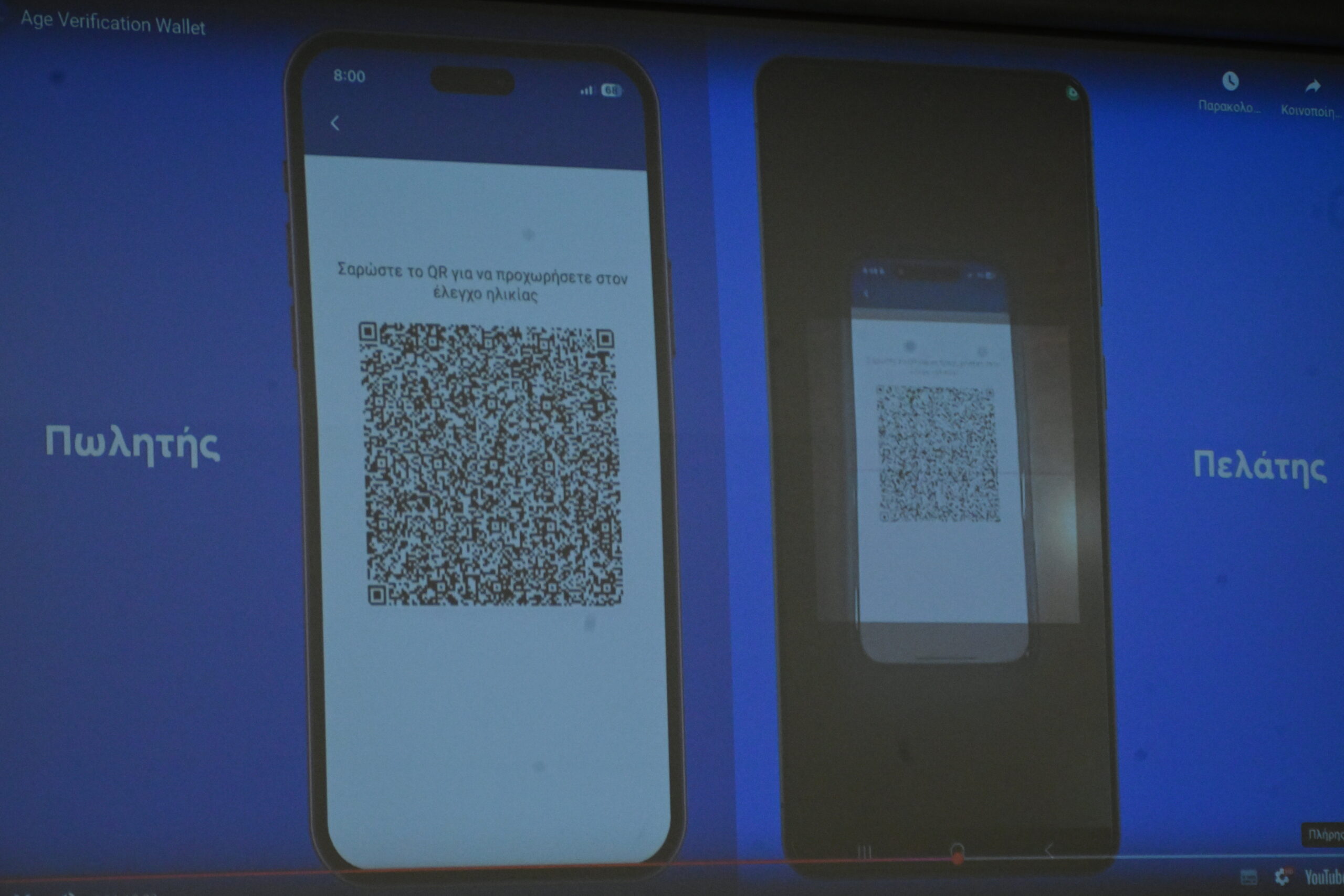 Το τρίτο εργαλείο είναι η ψηφιακή επαλήθευση ηλικίας, συμβατή με GDPR, όπου οι αγοραστές δείχνουν την νέα ταυτότητα μέσω Gov.gr wallet. Το σύστημα εμφανίζει QR Code και κόκκινο σήμα αν ο χρήστης είναι κάτω των 18 ετών. Ο πωλητής δεν χρειάζεται να συνδεθεί, διασφαλίζοντας αξιοπιστία και απλότητα.