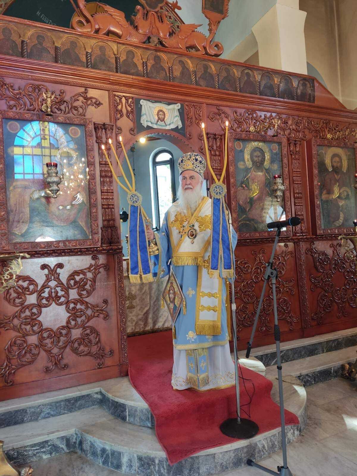 Το πρωί χοροστάτησε στον όρθρο και προεξήρχε στην πανηγυρική Θεία Λειτουργία, στης οποιας το τέλος μίλησε στους πιστούς για την σημασία του φωτός, που έλαμψε στο Θαβώρ κατά την Μεταμόρφωση του Σωτήρος, αλλά και στην αναγκαιότητα εκούσιας μετοχής μας σε αυτό το υπερκόσμιο Φως, πού μπορεί να διαλύσει τα πυκνά σκοτάδια της καθημερινότητάς μας.