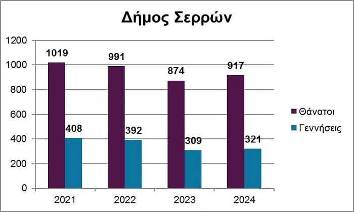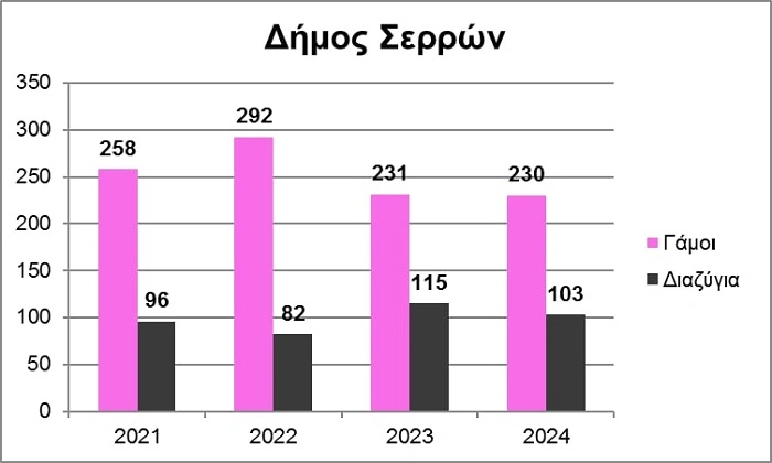 Συγκεκριμένα, στο Δήμο Σερρών, το 2024 δηλώθηκαν 321 γεννήσεις. Το 2023 ο αριθμός τους ήταν 309, το 2022 τις 392 και το 2021 ήταν χρονιά με 408 γεννήσεις. Σε ό,τι αφορά τους θανάτους, τα στοιχεία είναι αποκαρδιωτικά. Το 2024 «έφυγαν» από τη ζωή 917 συμπολίτες μας. Το 2023 οι θάνατοι που καταγράφηκαν ήταν 874, το 2022 ήταν 991 και το 2021 ο αριθμός των θανόντων έφτασε τους 1019. Με βάση τα στοιχεία του ληξιαρχείου, το 2024 τελέσθηκαν 230 γάμοι. Το 2023 231, το 2022 292 και το 2021 258 αποφάσισαν να ενωθούν με τα ιερά δεσμά του γάμου. Τα στοιχεία, επίσης, δείχνουν πως στο Δήμο Σερρών εκδόθηκαν το 2024 103 διαζύγια, το 2023 115, το 2022 82 και το 2021 96.