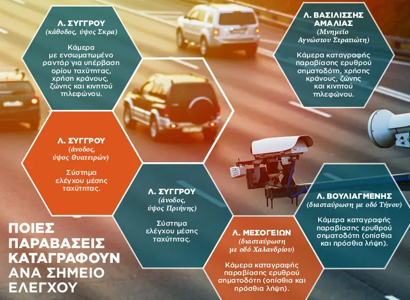 Οι κάμερες, ανάλογα με τον τύπο, βεβαιώνουν παραβιάσεις ερυθρού σηματοδότη, υπέρβαση ορίου ταχύτητας, χρήση κινητού τηλεφώνου και μη χρήση προστατευτικού κράνους και ζώνης ασφαλείας. Τα νέα ηλεκτρονικά μέσα διαθέτουν αυτόματη αναγνώριση πινακίδων (ANPR), η οποία μέσω ειδικού αλγόριθμου ανιχνεύει τη μάρκα, το μοντέλο και το χρώμα του οχήματος που πραγματοποιεί την παραβίαση, ενώ παράλληλα γίνεται κατηγοριοποίηση των παραβάσεων του ΚΟΚ. Κατά την καταγραφή επιτρέπεται από τα αρμόδια ελεγκτικά όργανα η περαιτέρω επεξεργασία των στοιχείων πινακίδας για την εξακρίβωση της τήρησης των κανόνων για ανασφάλιστα οχήματα, για ΚΤΕΟ, τέλη κυκλοφορίας και δακτύλιο.