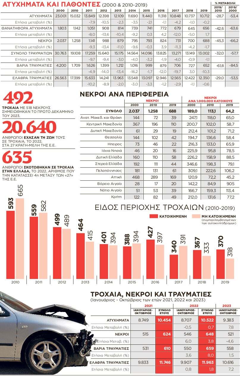 Οπως προκύπτει από στοιχεία της Τροχαίας, μόνο το πρώτο δεκάμηνο του 2023 σημειώθηκαν 492 τροχαία με 518 νεκρούς, ενώ παρατηρήθηκε αύξηση και κατά την εορταστική περίοδο των Χριστουγέννων η οποία δυστυχώς συνεχίζεται μέχρι σήμερα, με τις ανθρώπινες απώλειες να είναι σχεδόν καθημερινό φαινόμενο.