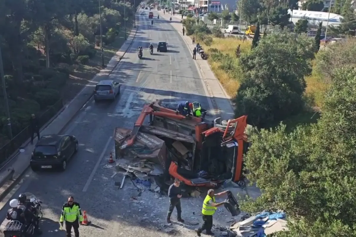 Το περιστατικό σημειώθηκε στο ύψος του παλαιού αεροδρομίου, στην περιοχή του Ελληνικού, με το βαρύ όχημα να καταλαμβάνει μεγάλο μέρος του οδοστρώματος στο ρεύμα προς Γλυφάδα. Η σφοδρότητα της ανατροπής είχε ως αποτέλεσμα τον εγκλωβισμό του οδηγού μέσα στην καμπίνα, γεγονός που κινητοποίησε άμεσα τις αρχές.