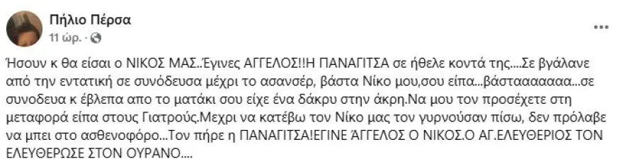 «Ήσουν κ θα είσαι ο ΝΙΚΟΣ ΜΑΣ..Έγινες ΑΓΓΕΛΟΣ!!Η ΠΑΝΑΓΙΤΣΑ σε ήθελε κοντά της….Σε βγάλανε από την εντατική σε συνόδευσα μέχρι το ασανσέρ, βάστα Νίκο μου,σου είπα…βάστααααααα…σε συνοδευα κ έβλεπα απο το ματάκι σου είχε ένα δάκρυ στην άκρη.Να μου τον προσέχετε στη μεταφορά είπα στους Γιατρούς.Μεχρι να κατέβω τον Νίκο μας τον γυρνούσαν πίσω, δεν πρόλαβε να μπει στο ασθενοφόρο…Τον πήρε η ΠΑΝΑΓΙΤΣΑ!ΕΓΙΝΕ ΆΓΓΕΛΟΣ Ο ΝΙΚΟΣ.Ο ΑΓ.ΕΛΕΥΘΕΡΙΟΣ ΤΟΝ ΕΛΕΥΘΕΡΩΣΕ ΣΤΟΝ ΟΥΡΑΝΟ»