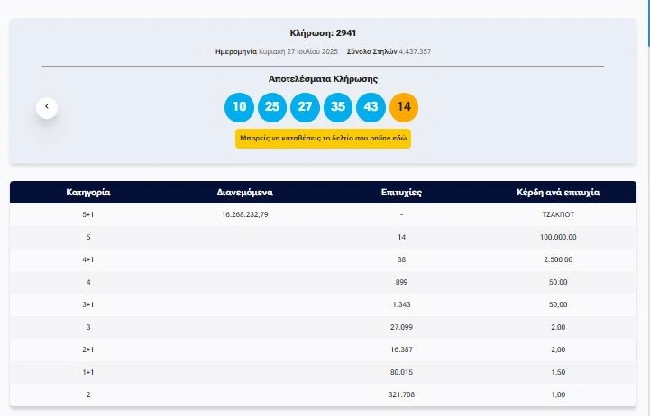 Οι τυχεροί αριθμοί στη σημερινή κλήρωση Τζόκερ είναι οι εξής: 10, 25, 27, 35, 43 και ο αρθμός Τζόκερ είναι το 14.