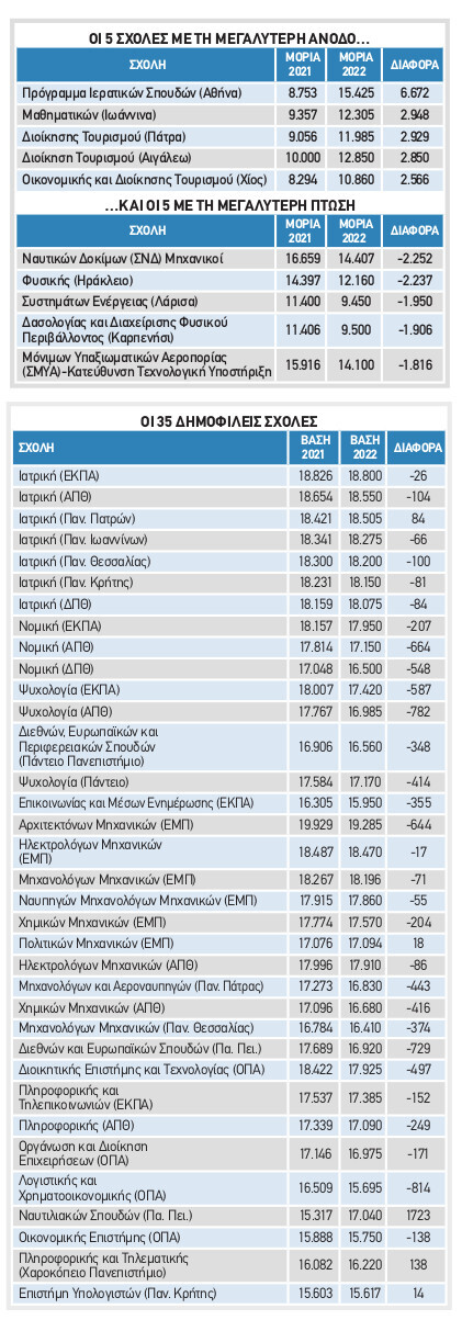 Αύξηση εμφάνισαν τα τμήματα Τουρισμού, με χαρακτηριστικά παραδείγματα τα Διοίκησης Τουρισμού σε Πάτρα και Αιγάλεω και το Οικονομικής και Διοίκησης Τουρισμού στη Χίο, τα οποία ανέβηκαν πάνω από 2.500 μόρια.