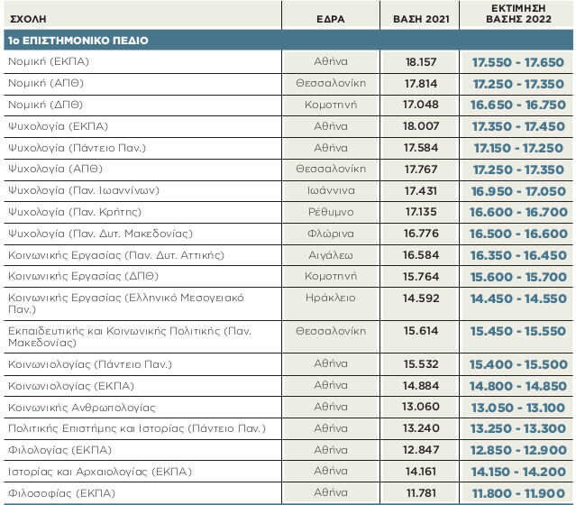Βάσεις 2022: 1ο Επιστημονικό πεδίο-Ανθρωπιστικών, Κοινωνικών και Νομικών Σπουδών