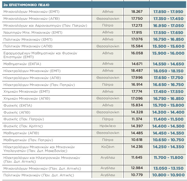 Από 200 έως και 500 μόρια κινούνται οι προβλέψεις για τις απώλειες στο 2ο επιστημονικό πεδίο, με τις πολυτεχνικές σχολές σε κεντρικά ιδρύματα αλλά και περιφερειακά να κινούνται κάτω από το όριο των 18.000, ένα όριο που είχαν χάσει σχεδόν όλες από πέρσι. Η κύλιση προς χαμηλότερες βαθμολογίες, στις πιο δημοφιλείς σχολές του εν λόγω πεδίου συνεχίζονται, σταματούν όμως στο όριο των 14.000 μορίων, όπου σε αυτές τις περιπτώσεις μπορεί να υπάρξει και μικρή αύξηση. Και σε αυτή την περίπτωση οι υψηλόβαθμες σχολές εκτιμάται ότι θα έχουν μείωση ακόμα και 400 μορίων, ενώ σε όσες κινούνται μεταξύ 10.000 και 14.000 μορίων αναμένεται συγκράτηση των βάσεων με μικρές μεταβολές που δεν θα ξεπερνούν τα 100 με 150 μόρια.