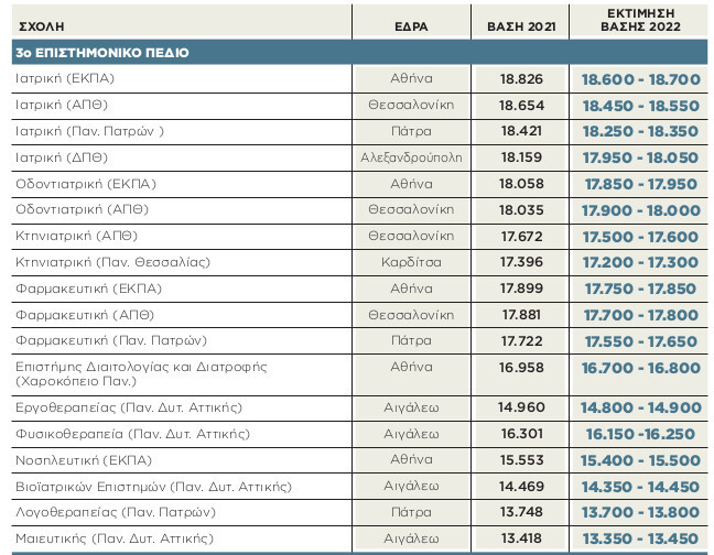 Βάσεις 2022: 3ο επιστημονικό πεδίο-Επιστημών Υγείας