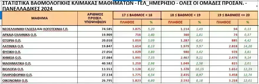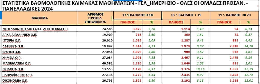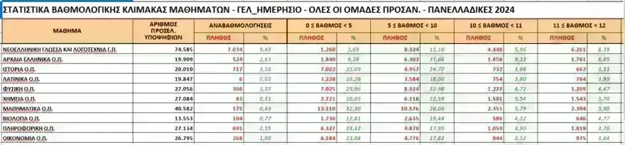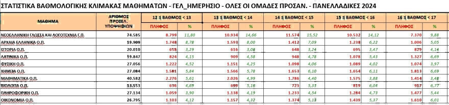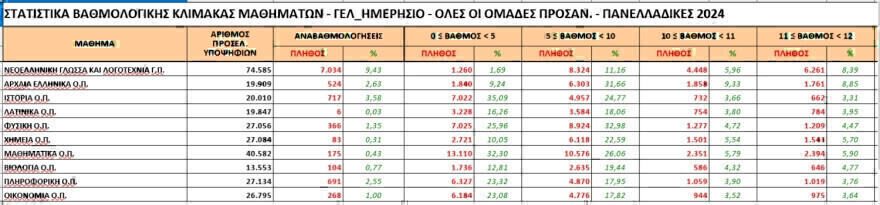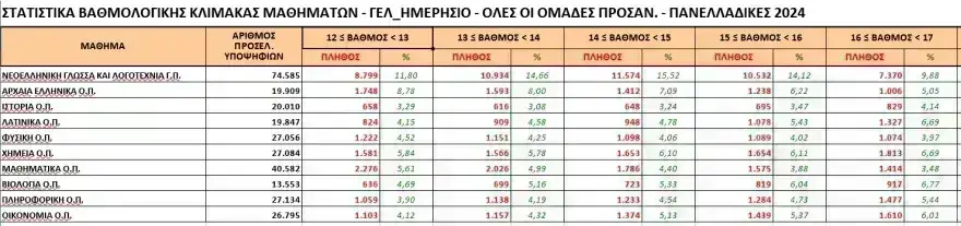 Να σημειωθεί ότι το πιο… βατό μάθημα φαίνεται πως ήταν η Νεοελληνική Γλώσσα και Λογοτεχνία, καθώς το 87,15% των μαθητών έγραψε πάνω από τη βάση.