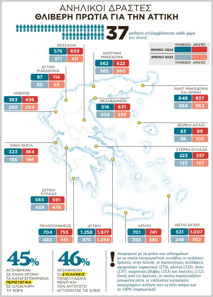 Μόνο στην Αττική, το πρώτο οκτάμηνο του 2024, οι Αρχές διαχειρίστηκαν 1.258 υποθέσεις με εγκληματική δραστηριότητα ανηλίκων, για τις οποίες συνέλαβαν 1.877 μαθητές. Τα καταγεγραμμένα περιστατικά αυξήθηκαν σε έναν χρόνο κατά 45%, ενώ οι συλλήψεις κατά 48%. Συνολικά σε ολόκληρη τη χώρα, οι συλλήψεις μέχρι και τον Αύγουστο άγγιξαν τις 9.000 (αύξηση 46%), ενώ οι υποθέσεις έφτασαν τις 7.180 (+47%). Ουσιαστικά, οι αστυνομικοί συλλαμβάνουν 37 μαθητές κάθε μέρα του έτους!