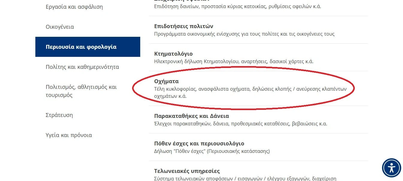 - Διαδρομή: gov.gr → Περιουσία & Φορολογία → Οχήματα