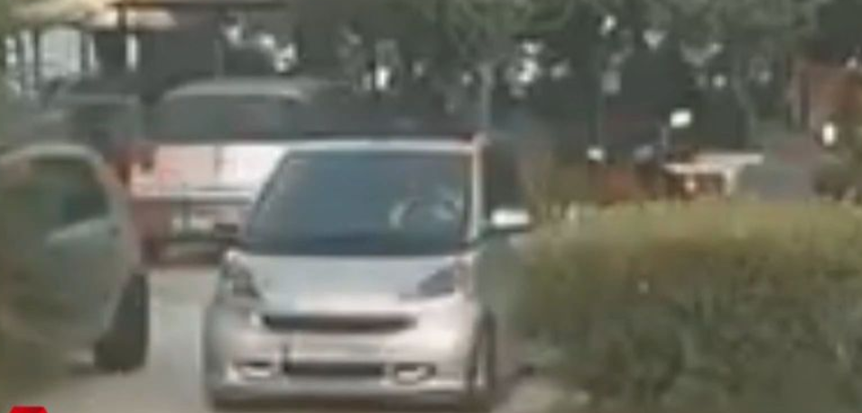 Ο διαρρήκτης, φορώντας ένα καπέλο προσεγγίζει ένα αυτοκίνητο μάρκας Smart και παραβιάζει την κλειδαριά του οχήματος από την πόρτα του οδηγού.