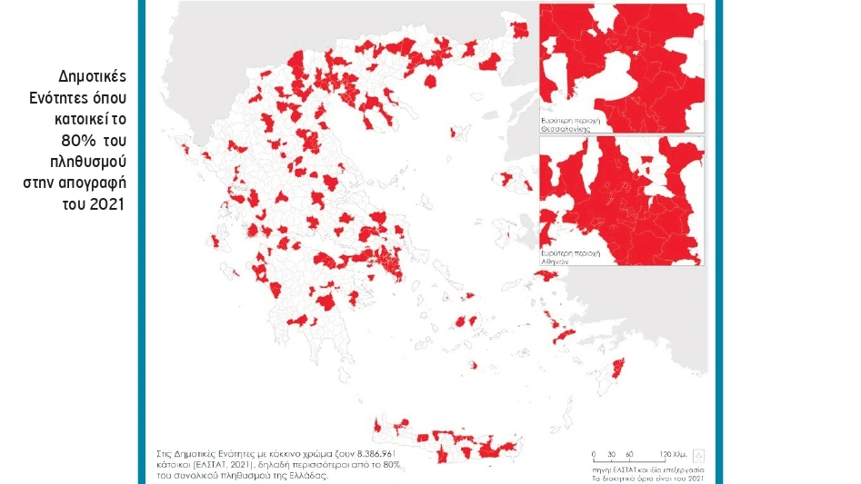 Ο κ. Κοτζαμάνης θυμίζει ένα στοιχείο που συχνά περνά απαρατήρητο: «Ενας στους δύο κατοίκους ζει στο 2% της επιφάνειας της χώρας». Από τους 12.500 οικισμούς της Ελλάδας, το 80% του πληθυσμού είναι συγκεντρωμένο σε μόλις 710. Η αστικοποίηση δεν είναι απλώς έντονη – είναι ακραία.