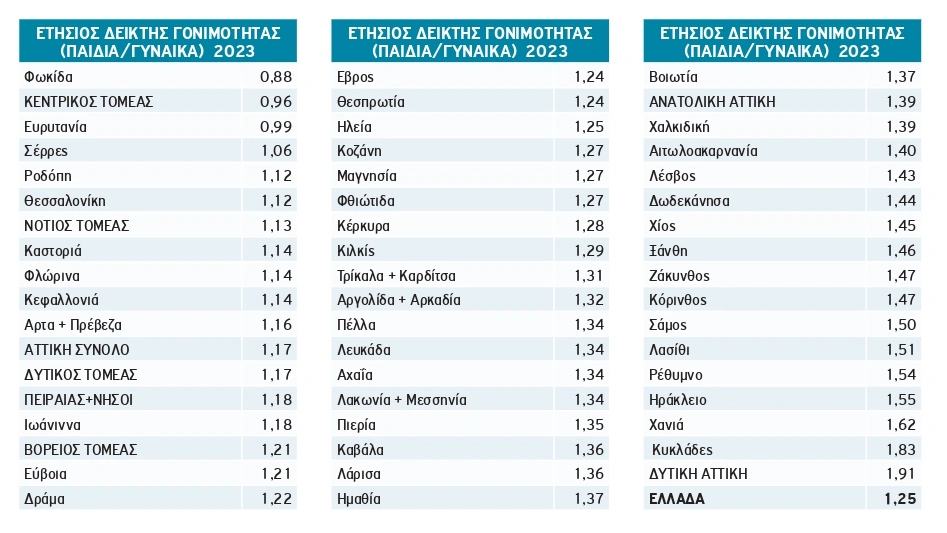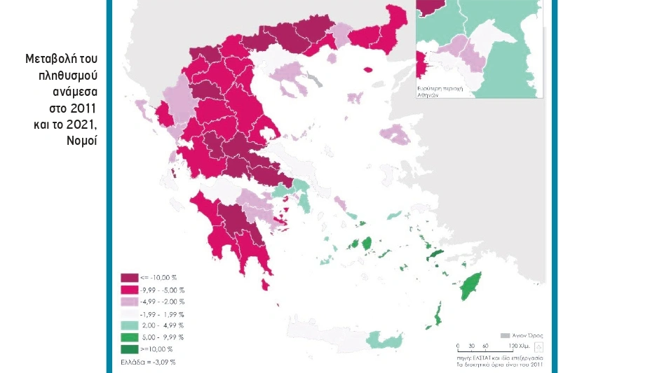 Πίσω από τους εθνικούς μέσους όρους κρύβονται ανισότητες «συνταρακτικές». Σε περιφερειακό επίπεδο καταγράφονται αποκλίσεις που φτάνουν έως και το -14% σε πληθυσμό, ενώ άλλες περιοχές αυξάνονται κατά 15%. Σε δήμους η απόκλιση είναι ακόμη μεγαλύτερη: Υπάρχουν περιοχές όπου ο πληθυσμός μειώνεται κατά 33%. Σε νομούς όπως τα Γρεβενά και η Ευρυτανία η αναλογία θανάτων προς γεννήσεις αγγίζει το 1 προς 3,7.