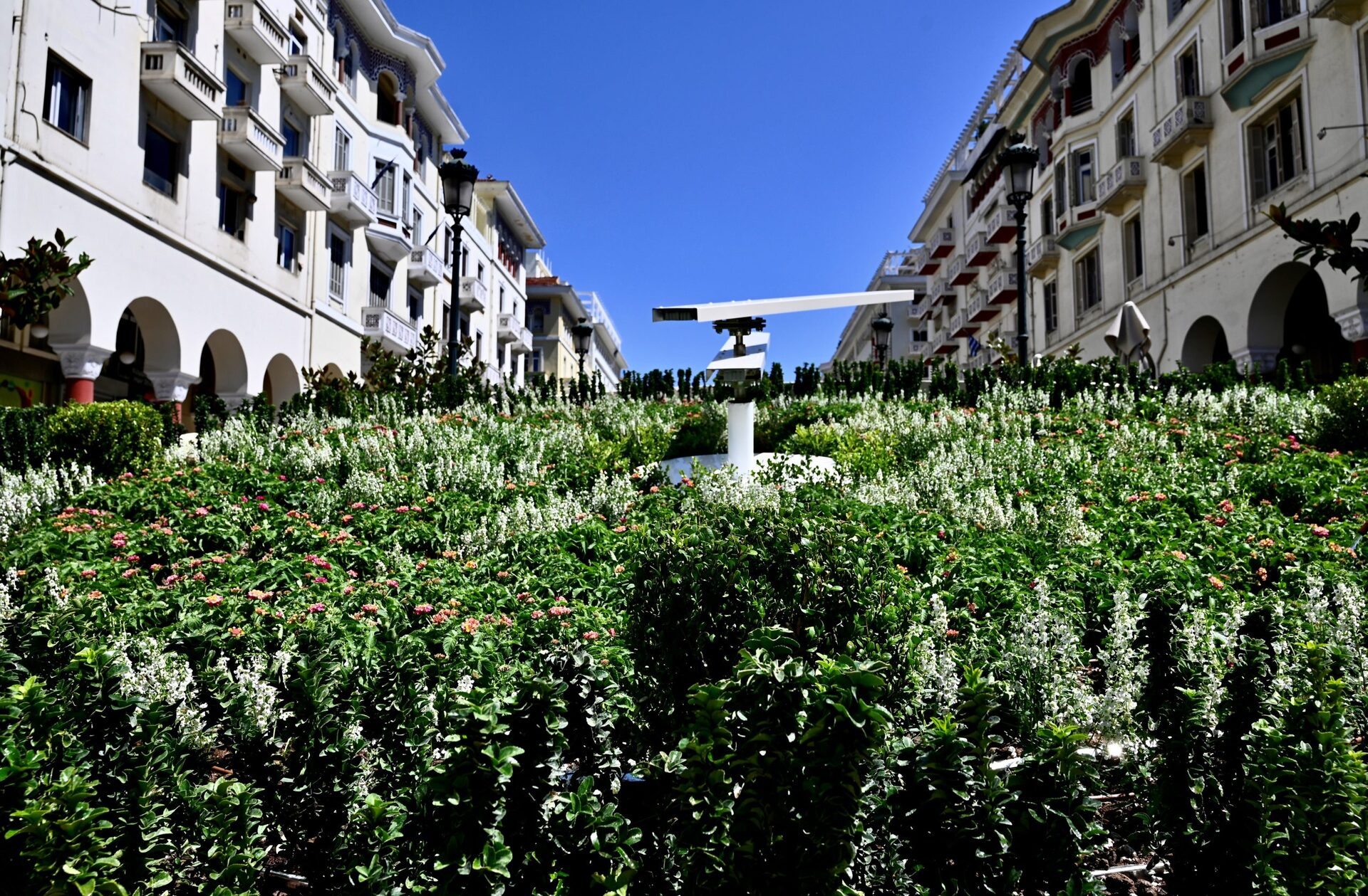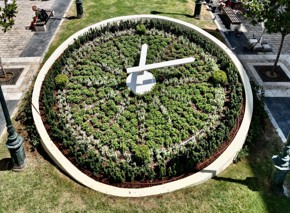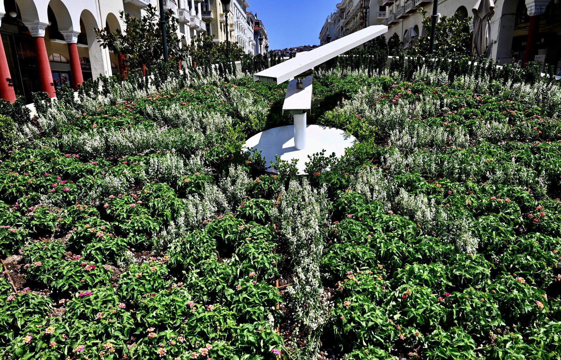 Το «Ρολόι Ανθοκομίας» στολίζουν 400 φυτά του είδους λαντάνα. Πρόκειται για φυτά που έχουν ανθοφορία όλο το καλοκαίρι και το φθινόπωρο -σε χρώμα φουξ με κόκκινο- και παράλληλα έχουν χαμηλή απαίτηση σε πότισμα. Τις φυτεύσεις συμπληρώνουν 500 λευκά αγγελόνια, που αγκαλιάζουν την περίμετρο του ρολογιού και τους δείκτες. Τα φυτά στο «Ρολόι Ανθοκομίας» θα ανανεώνονται ανά έξι μήνες, ώστε να υπάρχουν χρώμα και ζωντάνια όλες τις εποχές του χρόνου.