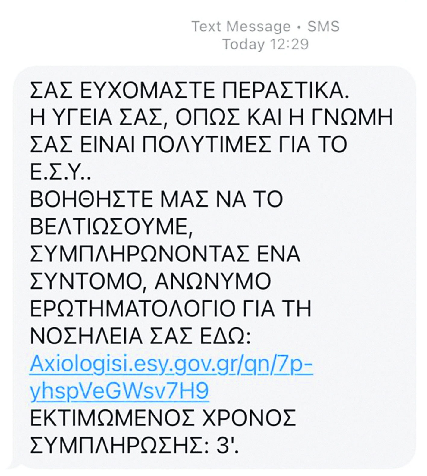 Το υπουργείο Υγείας παρακαλεί τους πολίτες, αν λάβουν SMS μετά τη νοσηλεία τους, να μην το αγνοήσουν. «Είναι ο πιο άμεσος τρόπος για να κάνει ο πολίτης τη φωνή του εργαλείο αλλαγής», τόνισε ο υπουργός.