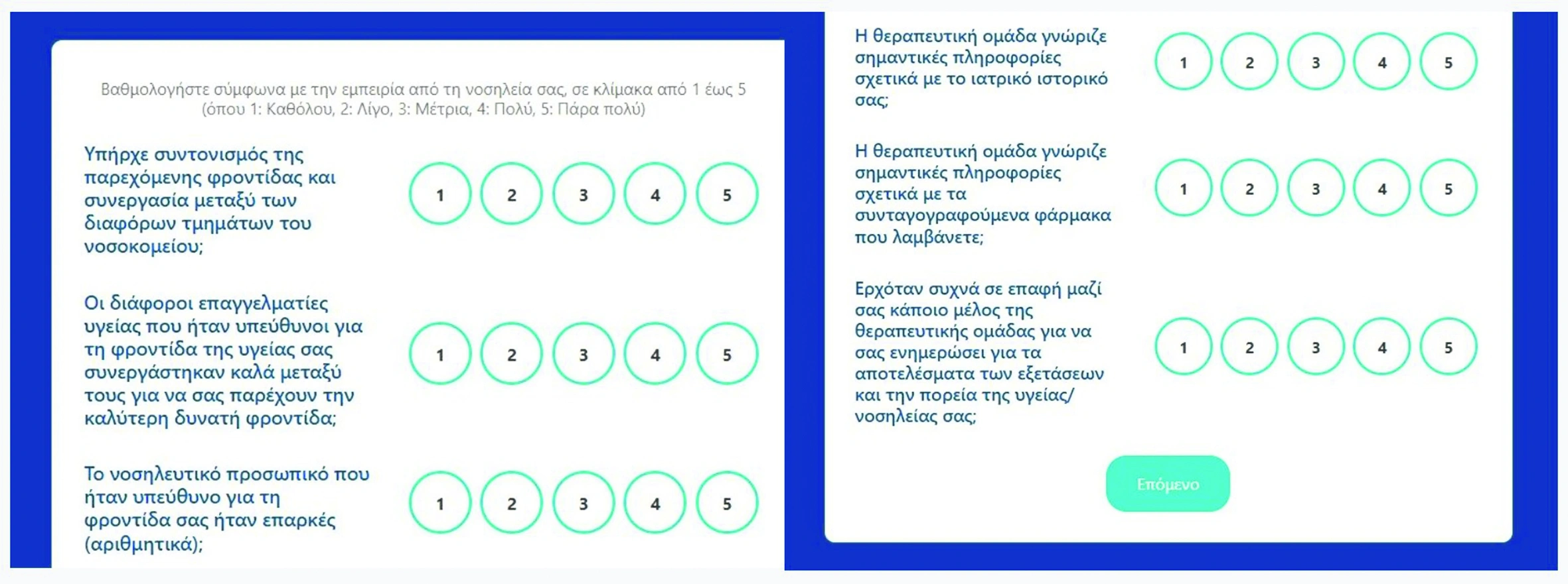 Η πρώτη φάση εφαρμογής περιλαμβάνει τα γενικά και πανεπιστημιακά δημόσια νοσοκομεία. Αργότερα, το πρόγραμμα θα επεκταθεί και στα παιδιατρικά και ογκολογικά νοσοκομεία, καθώς εκεί απαιτούνται νέα προσαρμοσμένα ερωτηματολόγια.