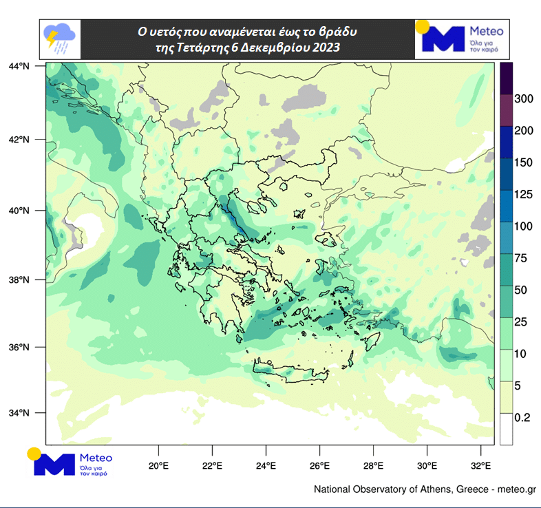 Στον χάρτη που ακολουθεί παρουσιάζεται ο υετός που αναμένεται έως το βράδυ της Τετάρτης 06/12.