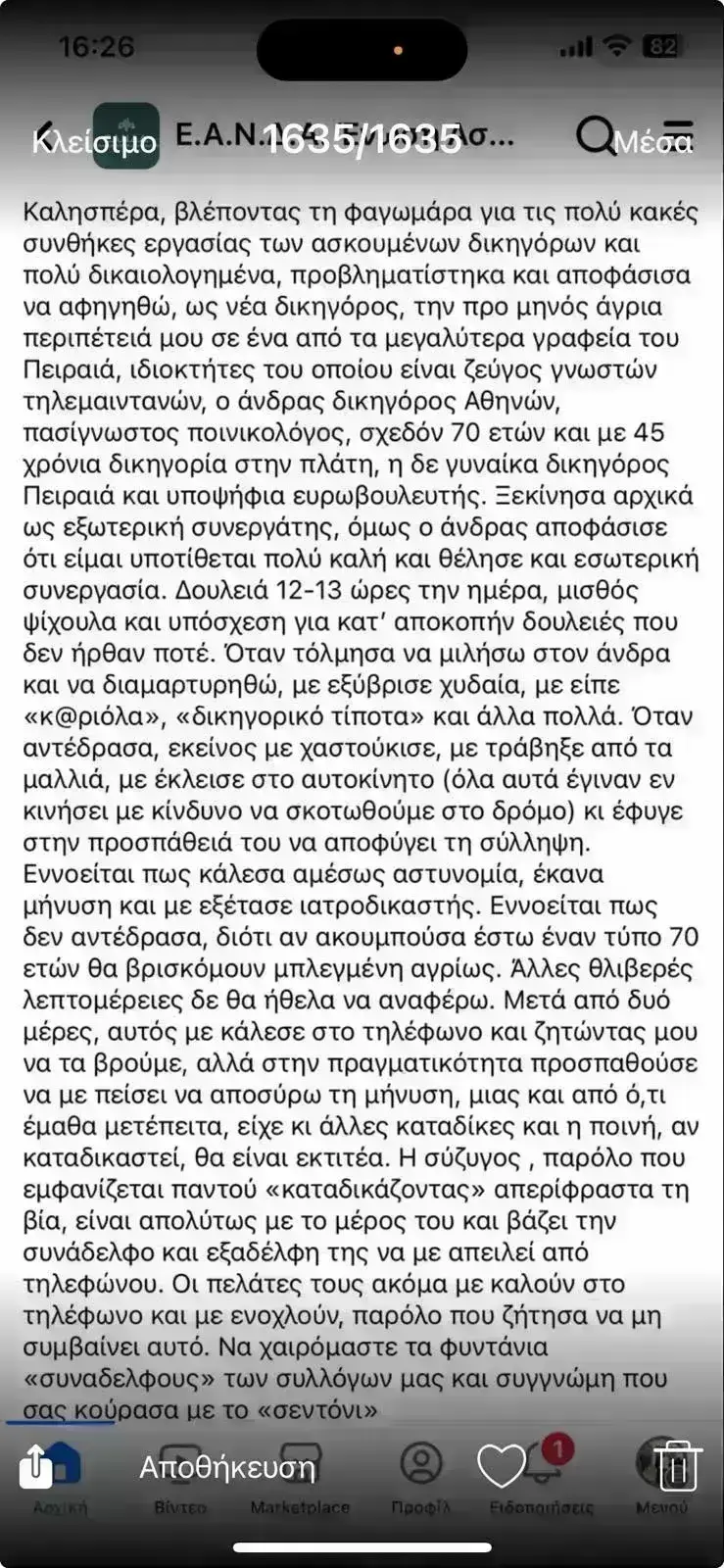 «Δουλειά 12 – 13 ώρες την ημέρα, μισθός ψίχουλα και υπόσχεση για κατ’ αποκοπήν δουλειές που δεν ήρθαν ποτέ. Όταν τόλμησα να μιλήσω στον άντρα και να διαμαρτυρηθώ, με εξύβρισε χυδαία, με είπε «κ…λα», «δικηγορικό τίποτα» και άλλα πολλά. Όταν αντέδρασα, εκείνος με χαστούκισε, με τράβηξε από τα μαλλιά, με έκλεισε στο αυτοκίνητο, όλα αυτά έγιναν εν κινήσει με κίνδυνο να σκοτωθούμε στο δρόμο, και έφυγε στην προσπάθεια του να αποφύγει την σύλληψη», λέει η ασκούμενη δικηγόρος που έκανε την καταγγελία.
