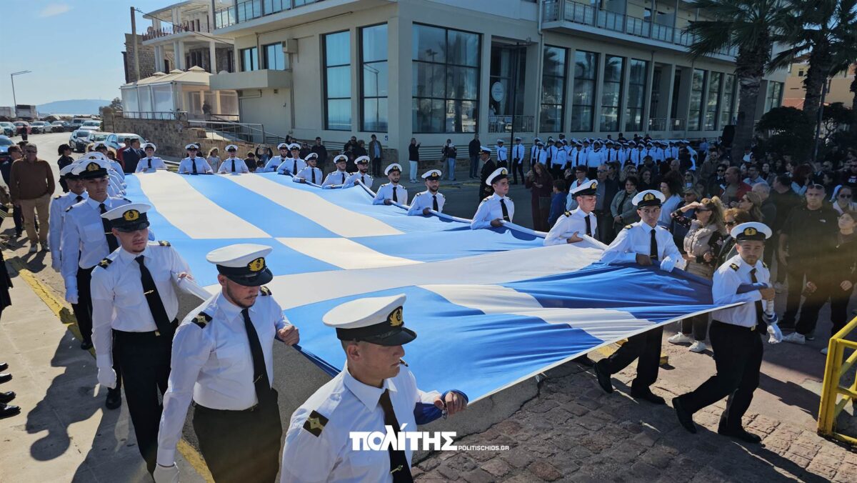 Παρουσία πλήθους κόσμου αλλά και των αρχών του νησιού πραγματοποιήθηκε στις 12 το μεσημέρι της Κυριακής, στον νότιο λιμενοβραχίονα του κεντρικού λιμένα του νησιού η έπαρση της μεγάλης σημαίας. Τη σημαία μετέφεραν με πομπή, στον χώρο της έπαρσης οι σπουδαστές της ΑΕΝ Μηχανικών Χίου με τη Φιλαρμονική του Δήμου Χίου να παιανίζει στρατιωτικά εμβατήρια.