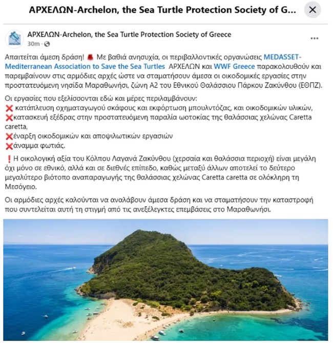 Με κατεπείγουσα επιστολή τους προς την ΥΔΟΜ Ζακύνθου, οι περιβαλλοντικές οργανώσεις τονίζουν πως οι υπό εξέλιξη εργασίες στο Μαραθονήσι απειλούν με σοβαρότατη και άμεση υποβάθμιση την παραλία, μέσω της συμπίεσης της άμμου από τα βαριά μηχανήματα, αλλοίωση της γεωμορφολογικής σύνθεσής της λόγω αναμενόμενης διάβρωσης από τις εκχερσώσεις, καταστροφή των αμμοθινών, και εν τέλει σοβαρή όχληση της ίδιας της διαδικασίας ωοτοκίας, η περίοδος της οποίας ξεκινάει την 1η Μαΐου.