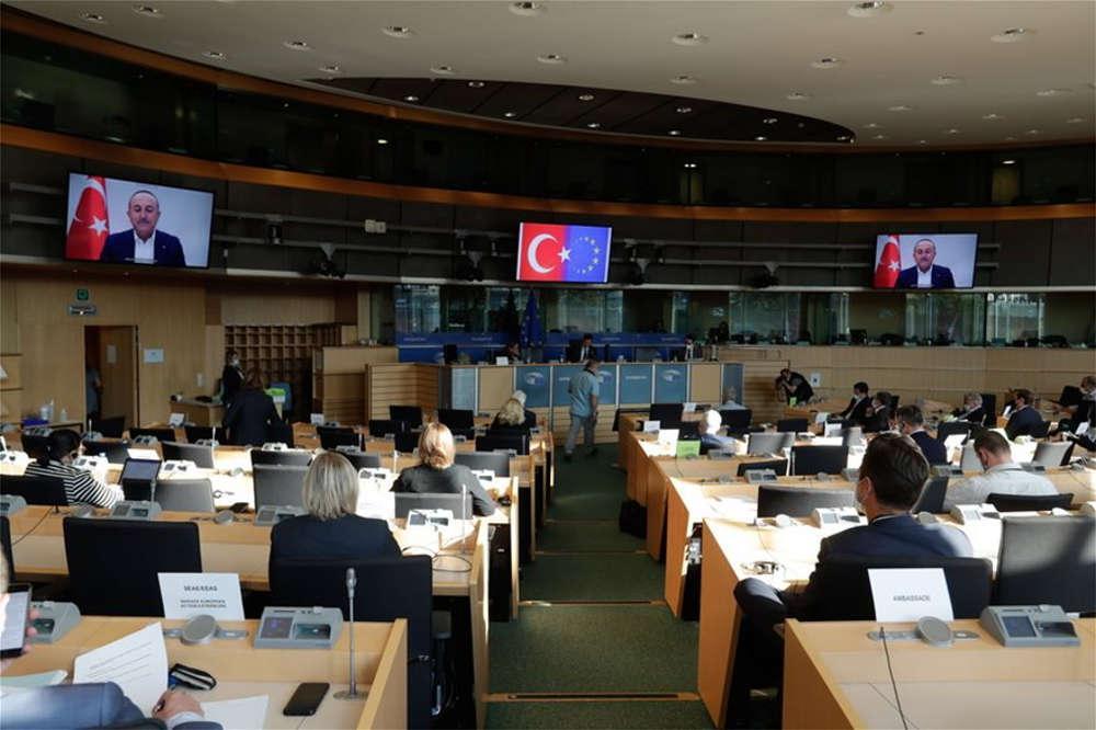 Συγκεκριμένα, με την έναρξη της σύνδεσης με το γραφείο του, στα μόνιτορ εμφανίστηκε η εικόνα του Τούρκου υπουργού Εξωτερικών αλλά και ένα γράφημα που έδειχνε στα αριστερά την τουρκική σημαία και δεξιά τη σημαία της ΕΕ ως ημισέληνο…