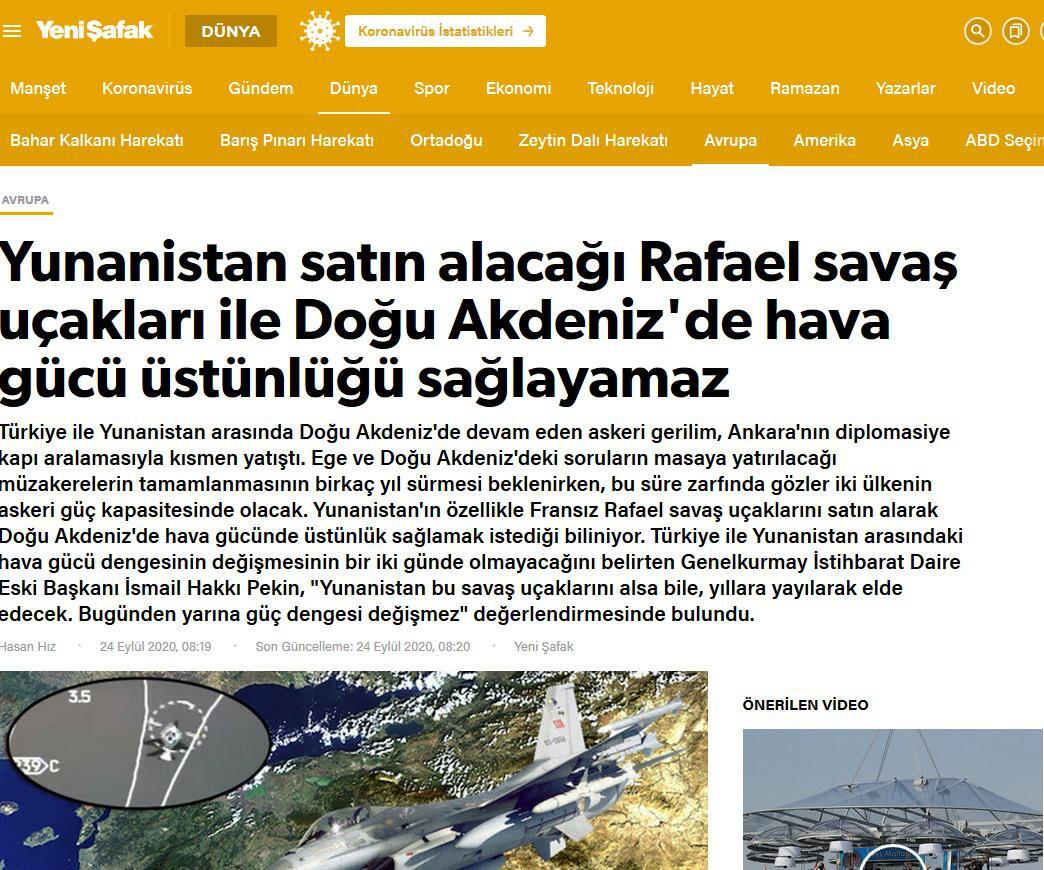 Η τουρκική εφημερίδα Yeni Safak σε σημερινό της δημοσίευμα το οποίο επικαλείται την άποψη του πρώην επικεφαλής της διεύθυνσης πληροφοριών του Γενικού Επιτελείου, Ισμαήλ Χακκί Πεκίν, αναφέρει ότι η αεροπορική ισορροπία θα άλλαζε μόνο αν ο Μακρόν έπαιρνε 30-40 Rafale και τα έφερνε σε μια μέρα στην Ελλάδα.
