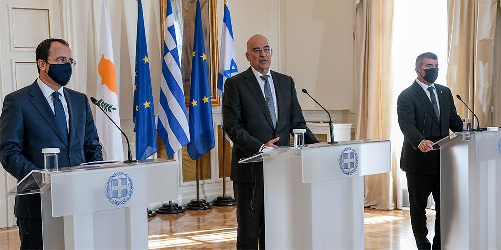 «Δημιουργούμε μια νέα γεωγραφία κατανοήσεων που διαπερνά τα παλιά στερεότυπα, που ανασχηματίζει τον χάρτη της περιοχής μας», επεσήμανε ο κ. Δένδιας και τόνισε πως το τριμερές σχήμα συνδέεται με κοινές αξίες, κοινούς δεσμούς φιλίας, αλλά και κοινές προκλήσεις και υποστηρίζεται σθεναρά και από την ΕΕ και από τις ΗΠΑ, καθώς στηρίζεται στη διεθνή νομιμότητα.