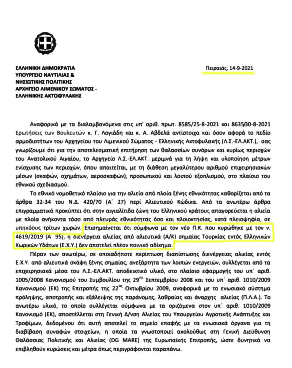 Να σημειωθεί ότι μόλις πριν από τρία χρόνια το υπουργείο Γεωργίας και Δασών της Τουρκίας εξέδωσε οδηγία προς τους Τούρκους ψαράδες να μην ενεργούν στα ελληνικά χωρικά ύδατα, έπειτα από τις συνεχείς καταγγελίες που κατέφθασαν στο τουρκικό υπουργείο Εξωτερικών, αλλά και τις μεγάλες διαστάσεις που έλαβε το θέμα στον ελληνικό Τύπο. Συγκεκριμένα, σε έγγραφο, με ημερομηνία 3 Σεπτεμβρίου 2018, το οποίο απευθύνεται προς τις αντίστοιχες διευθύνσεις Αγροτικής Πολιτικής των νομαρχιών Αδριανούπολης, Δαρδανελίων, Μπαλικεσίρ, Αϊδινίου, Μούγλας και Σμύρνης, αναφερόταν επί λέξει: «Προς αποφυγήν ανεπιθύμητων περιστατικών και ατυχημάτων, αλλά και προς αποφυγήν πρόκλησης βλάβης στις έννομες και πολιτικές θέσεις της χώρας μας, παρακαλούμε να ενημερώσετε και προειδοποιήσετε τους αλιείς μας, ώστε να αποφεύγουν ενέργειες, οι οποίες δεν μπορούν έπειτα να δικαιολογηθούν ή υπερασπιστούν από την πλευρά μας». Ομως, στην πράξη αποδεικνύεται ότι η Αγκυρα χρησιμοποιεί ως «μακρύ χέρι» τους Τούρκους ψαράδες επιχειρούσα να «αγκαλιάσει» το Αιγαίο.