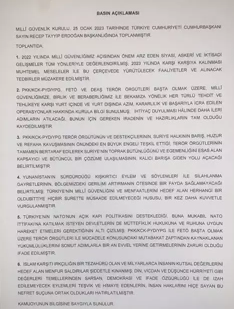 Το Συμβούλιο Εθνικής Ασφαλείας της Τουρκίας συνεδρίασε σήμερα Τετάρτη 25 Ιανουαρίου για περίπου τρείς ώρες και 40 λεπτά με βασικό αντικείμενο την Ελλάδα και τα εξοπλιστικά προγράμματα της Αθήνας. Σύμφωνα με την ανακοίνωση που εξέδωσε η Άγκυρα, τονίζεται πως η Τουρκία «δεν θα δεχθεί τετελεσμένα από την Ελλάδα που θα απειλούν την εθνική ασφάλεια και τα συμφέροντα της». Επισημαίνεται ότι «αν χρειαστεί η Τουρκία θα προχωρήσει στο επόμενο βήμα και πως η προετοιμασία έχει ολοκληρωθεί ενώ υπάρχει και η απαιτούμενη βούληση».