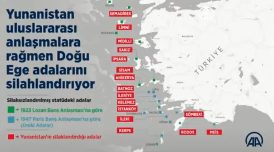 Ο υπουργός Εξωτερικών της Τουρκίας, επανέλαβε για άλλη μια φορά ότι η Ελλάδα παραβαίνει τους όρους των συνθηκών και πρέπει να προχωρήσει στην αποστατιωτικοποίησή τους. Αλλιώς, προειδοποίησε, θα αρχίσει η συζήτηση για την κυριαρχία τους.