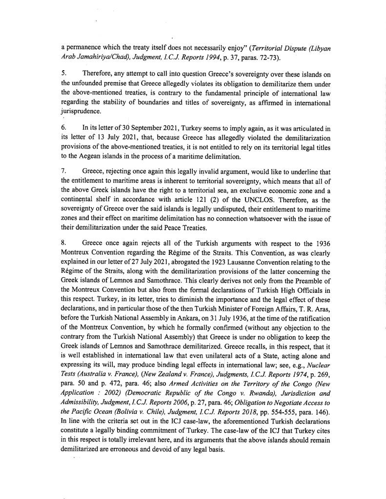 Παράλληλα, υπογραμμίζεται ότι τα νησιά αυτά, σύμφωνα με τις σχετικές προβλέψεις της Σύμβασης του ΟΗΕ για το Δίκαιο της Θάλασσας -άρθρο 121 (2)-, έχουν δικαιώματα σε χωρικά ύδατα, Αποκλειστική Οικονομική Ζώνη και υφαλοκρηπίδα. Στο πλαίσιο αυτό, η Ελλάδα απορρίπτει στο σύνολό τους τις σχετικές αιτιάσεις της Τουρκίας. Η επιστολή, επίσης, απορρίπτει στο σύνολό τους τις τουρκικές αιτιάσεις σχετικά με την αποστρατιωτικοποίηση των νησιών του Αιγαίου, υπογραμμίζοντας ότι οι αιτιάσεις αυτές, οι οποίες δεν στέκουν νομικά, αλλά έχουν καθαρά πολιτικά κίνητρα, τροφοδοτούν έτι περαιτέρω την αστάθεια που προκαλεί η Τουρκία με τις ενέργειές της.