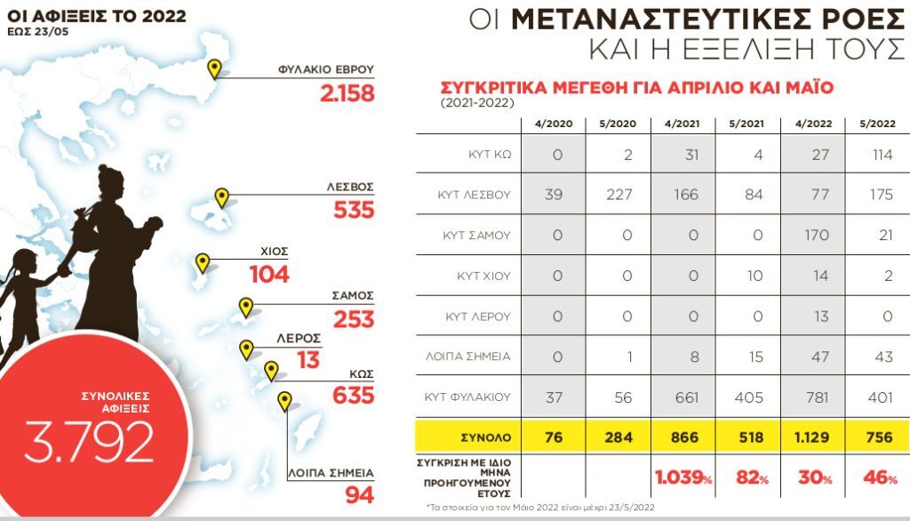 Ηδη στις αφίξεις Απριλίου και Μαΐου παρατηρείται αύξηση 30% και 46% με τους αντίστοιχους μήνες του 2021. Το Κέντρο Υποδοχής και Ταυτοποίησης Εβρου έχει τα πρωτεία με διαφορά και ακολουθούν η Λέσβος και η Κως.