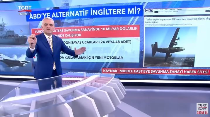 «Και εμείς στην αμυντική βιομηχανία καλά πηγαίνουμε Αλλά για το διάστημα των 5-10 ετών που χρειάζεται η Τουρκία για να ενταχθούν αυτά τα ελικόπτερα και αεροπλάνα που κατασκευάζει η Τουρκία, υπάρχουν αεροσκάφη και άρματα μάχης τα οποία πρέπει επειγόντως να αγοράσει και να εκσυγχρονίσει. Και για αυτό το λόγο συζητάμε με την Αγγλία» τόνισε ο δημοσιογράφος του TGRΤ.